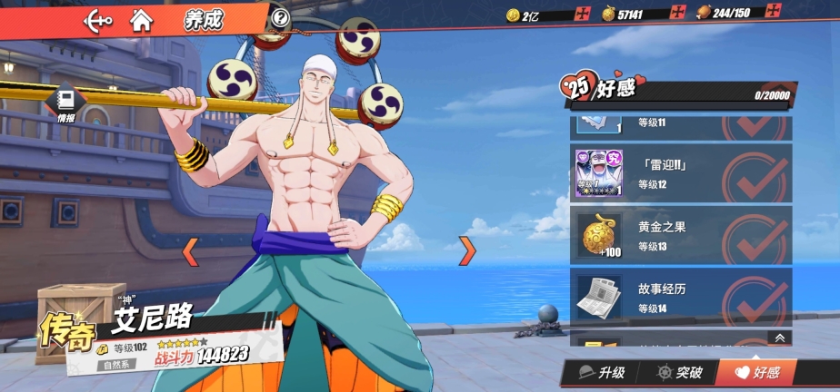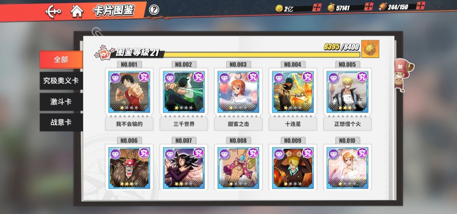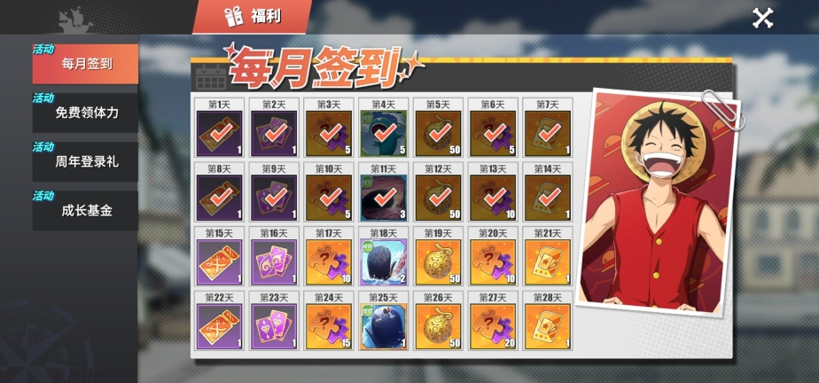 3、要是各位计划零氪或者微氪,那么在开局伙伴培养方面,主要培养路飞、索隆、奈美作为主力伙伴就好。即便零氪,大约一个月时间也能把A卡路飞提升到六星全金,要知道六星的A卡在实用性上比五星的SS卡更高。当然,各位也能挑选自己钟爱的伙伴进行培养。