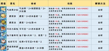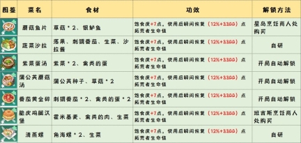 1. 海鲜汤:食材包含角海螺、惑哒贝以及生菜,食用后可增加冰冻攻击1% + 35 。