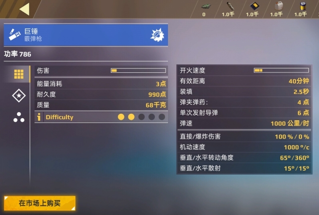 对萌新工程师来说,要是作战风格是“战车格斗”,也就是利用快速的轻型车辆展开近距离战斗,那霰弹枪就是相当不错的选择。就像下图中的“巨锤”霰弹枪,它的弹夹能装4发弹药,每次发射会射出6枚弹丸,而且稀有度只是蓝色,在游戏前期属于性价比极高的物资。