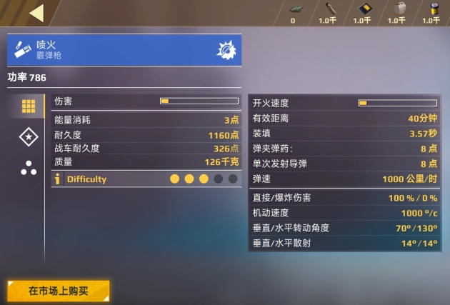 就像上图里的“喷火”霰弹枪,其耐久度相较于“巨锤”提高到了1160,同时具备326点战车耐久度。除此之外,它的弹夹内有8发弹药,每次可以发射8枚弹丸,单次射击的火力投射能力比“巨锤”提升了33.3%,全弹夹射击的火力投射能力更是提升了166.67% 。