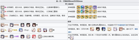 2、航一队,该航队是比较通用的boss队。其优势在于手动操作能力较强,吃拐率更好,组队方式相对简单;不足之处在于面对航母boss以及20秒护盾时稍显乏力,对装备的要求较高。鉴于航队有较多可供选择的辅助角色,所以通常会把海伦娜留给战列队;要是自身实力足够强大,就可以不用考虑这一点。航一队拥有留存空袭的手段,能够通过此方法击杀复苏之风这类难点敌人,或者主动避开盾系词条等;一般主要用于应对战列boss,对战重巡时能形成屠杀局面,还可顺带打击轻甲目标。