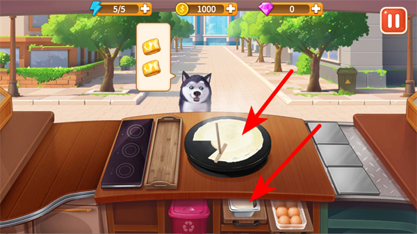 1. 在楼下早餐店游戏的制作界面开启后,首先准备面饼,接着添加酱料。