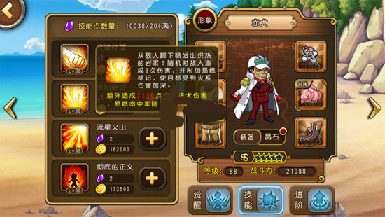 【特别提醒】:赤犬的2技能是稳定给对方加上易燃效果,而三技能则是一定几率,在新版本中很多玩家反映控制技能或者这种易燃技能没有效果,原因是你角色的技能等级低了,要想稳定给对方加上BUFF效果,需要技能等级到达80+。