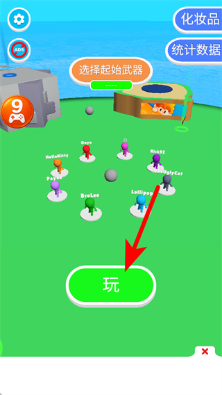 1. 在界面中点击绿色的“玩”按钮,即可进入游戏,并且在进入游戏时还能够选择起始武器来开启对局。