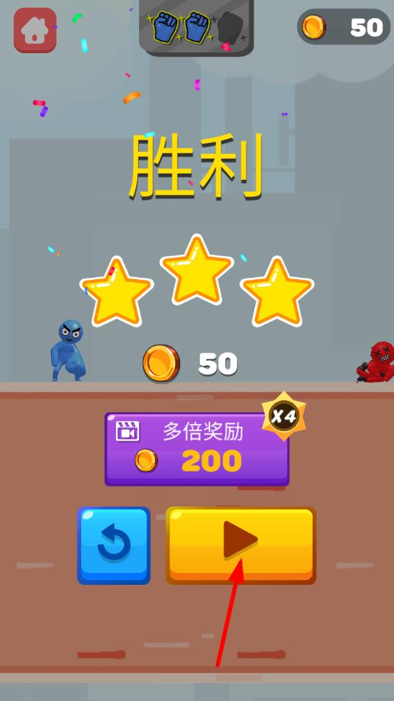 2、拳头飞行期间,能再次滑动屏幕改变转向,借助反弹等手段击中隐蔽位置的小人,把所有目标消灭就能通关,同时收集关卡里的奖励道具。
