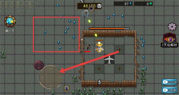 4、游戏开始后,能够借助左下角的虚拟摇杆操控角色移动,同时收集掉落的资源并避开怪物。