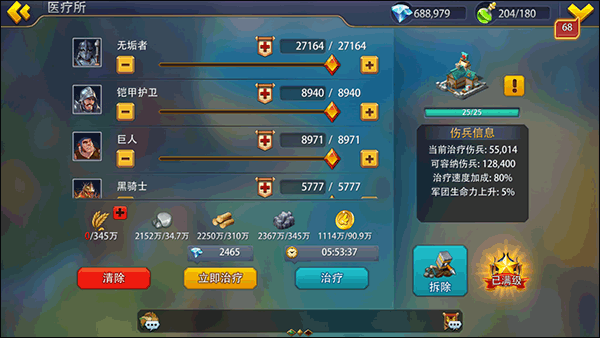 玩家能够用比训练新兵少一些的资源,治疗医疗所里的部队。医疗所的等级最高能升到25级,而提升医疗所等级或者建造更多医疗所,都可以增加容纳伤病部队的数量。