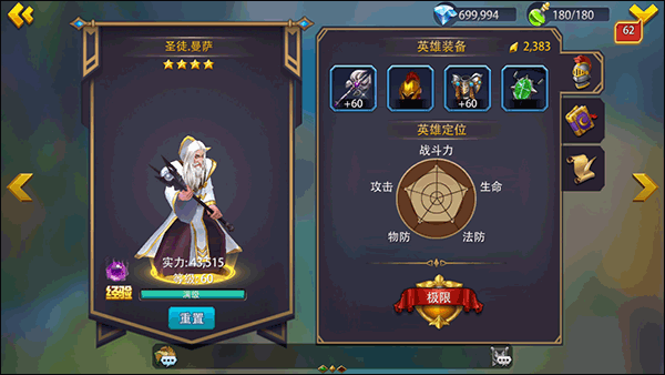 英雄、装备、技能、关卡、擂台战斗酣畅淋漓。