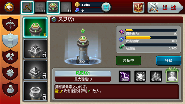 拥有风元素之力的塔,攻击能额外弹射1个敌人。