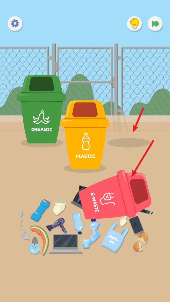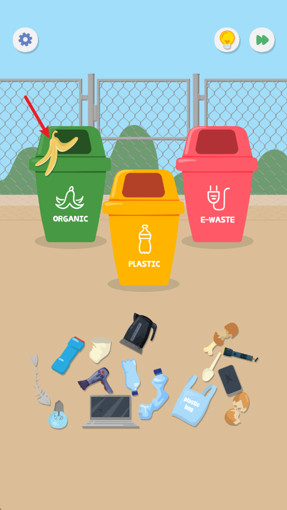 3、接下来需要按照垃圾分类的要求,把不同的垃圾投放到对应的垃圾箱里,比如像果皮这类垃圾,就应该放入第一个绿色的垃圾箱中。