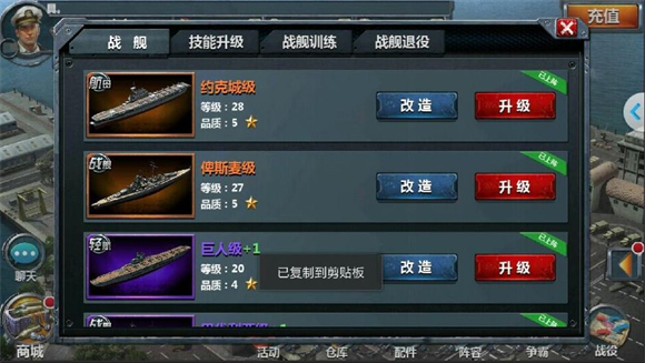 3、游戏里提升战斗力最核心的办法是升级战舰,升级战舰的操作可在码头完成。进入码头后,在首个选项卡“战舰”界面中,能看到“改造”和“升级”两个选项,这两种方式对舰船而言都是快速提升战斗力的有效途径。这里要再次提醒:不要建造两艘相同的船,避免无法进行改造。当收集齐改造所需的图纸后,“改造”按钮旁会出现红点提示该船可改造,若这艘船是你计划长期培养的,那就果断进行改造吧。