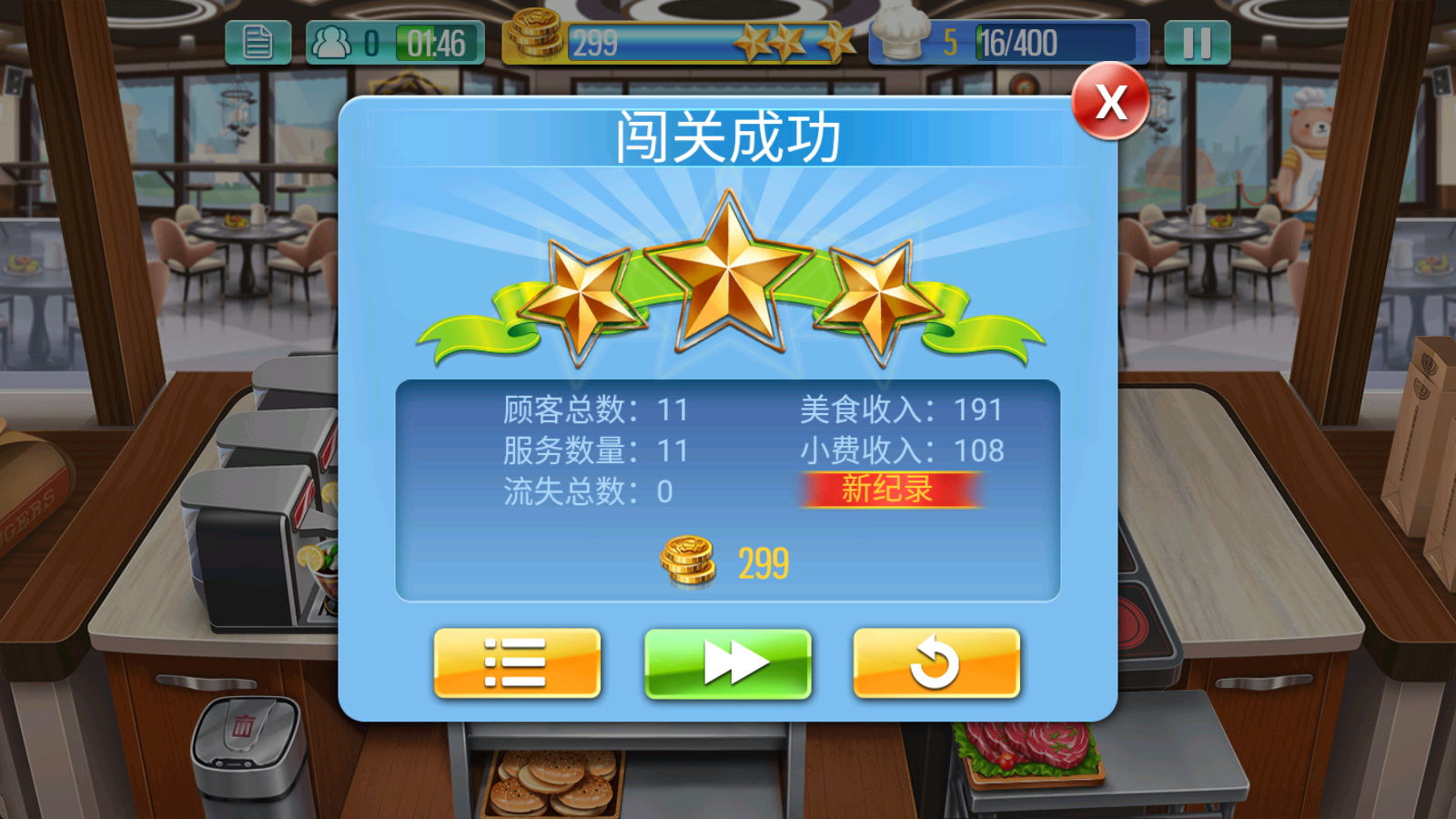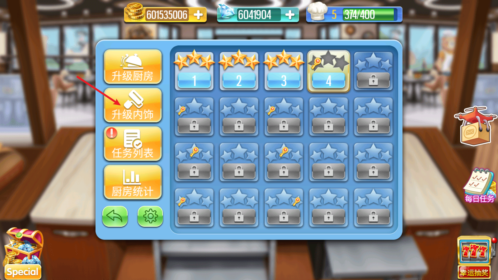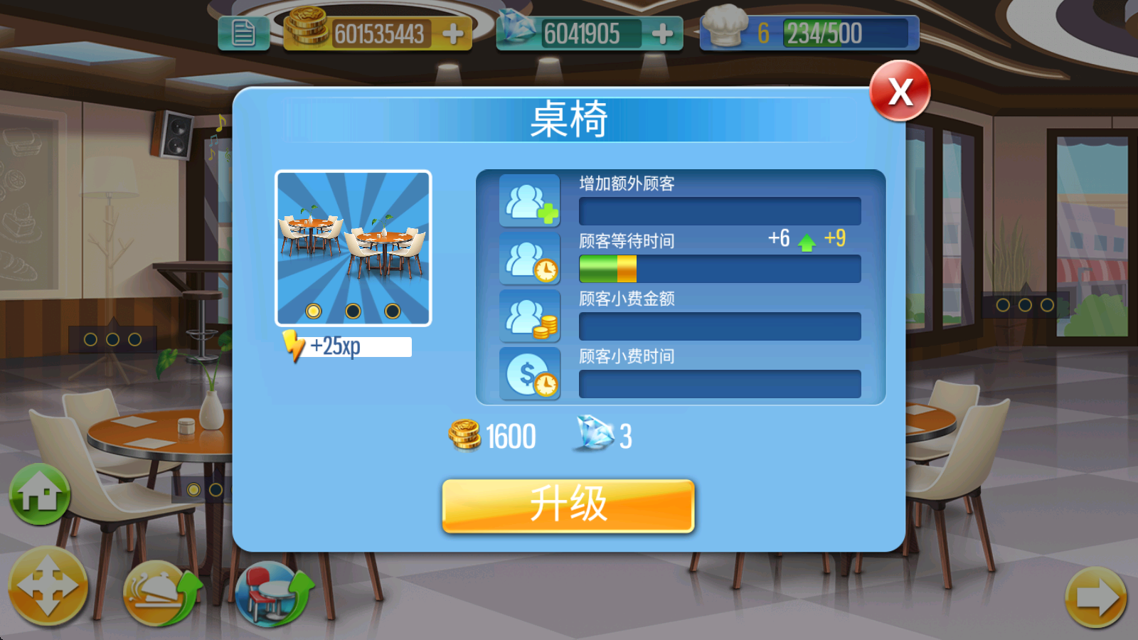 2、用收入来升级你的厨房用具和食物原料,并且升级餐厅的各类装饰,这样就能争取到更多顾客和更多收入。