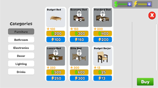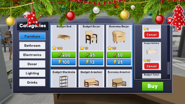 2、从家具、浴室、电子产品、装饰、照明等各种类别的物品中选择你喜欢的,然后自由的去装饰房间,定制成你喜欢的样子。