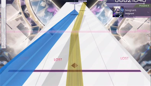 5、解锁阶段:此阶段限制使用normal收集条游玩Lament Rain。关卡结尾会出现红色天空轨道,其弯折处有隐形天键且节奏对应背景嘀嗒声,需要击中至少三个隐形天键才可以触发异象并进入Designant.,若击中数量不足则异象效果会在曲目即将结束时消失并进入结算界面且无法进入Designant.,完成游玩后解锁曲目的所有难度,解锁洞烛的被动技能,并隐藏假的尼尔地图。