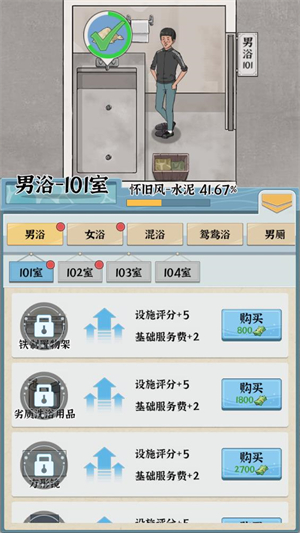 1进入游戏后,点击下方第一个按钮即可升级浴场,解锁各类装饰物品。