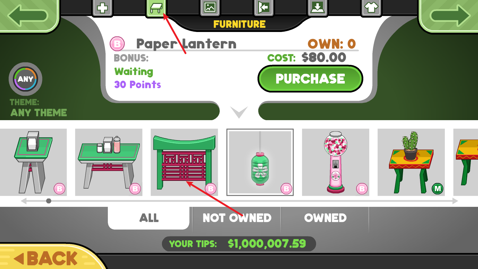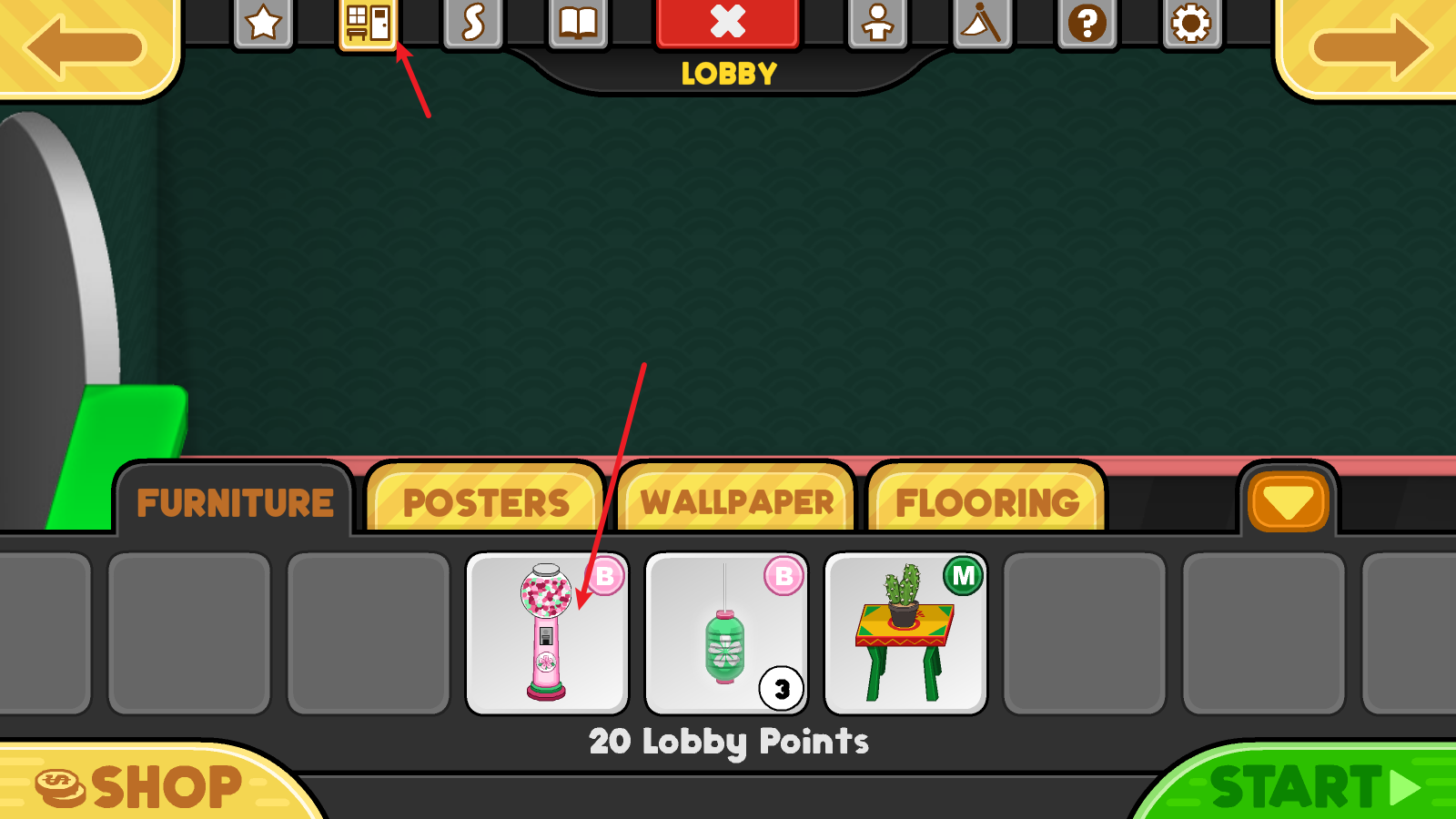 4接下来返回操作界面,找到顶部的第二个选项并点击,这样就能把之前购买的装饰物品摆放出来了。