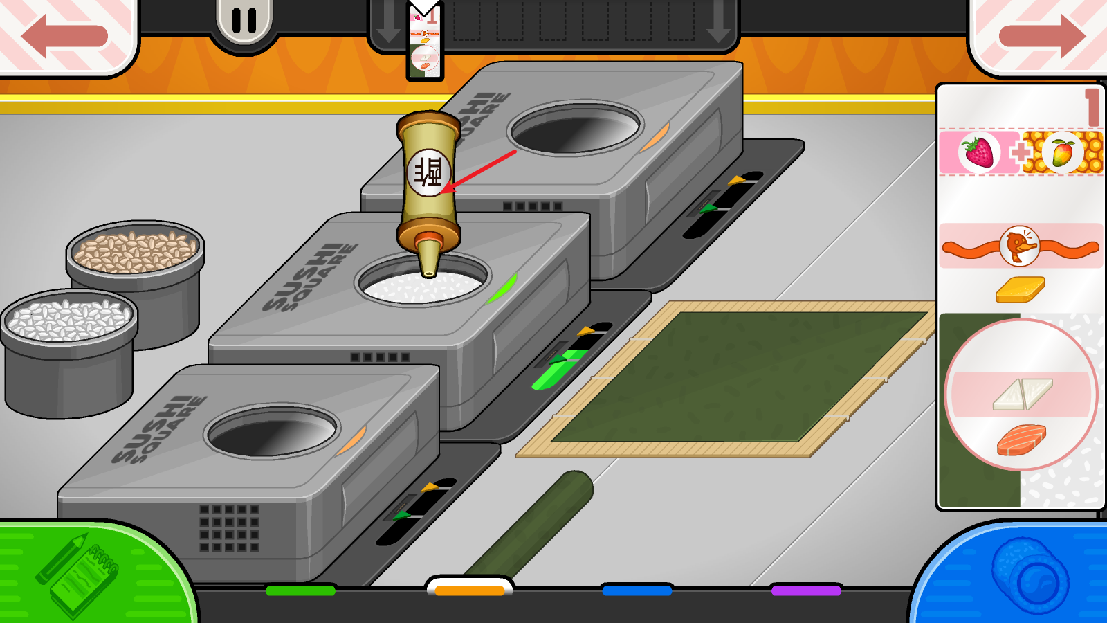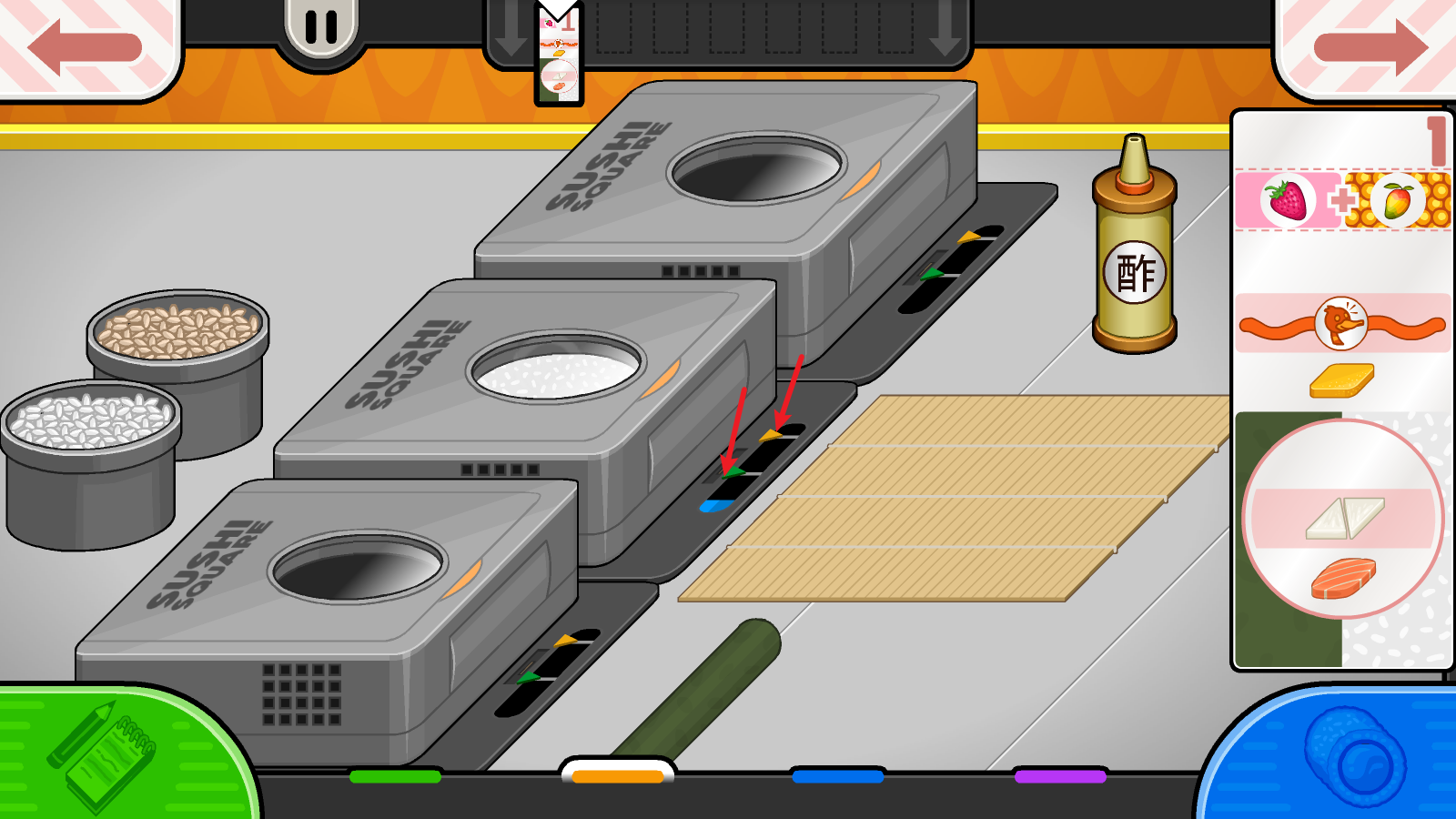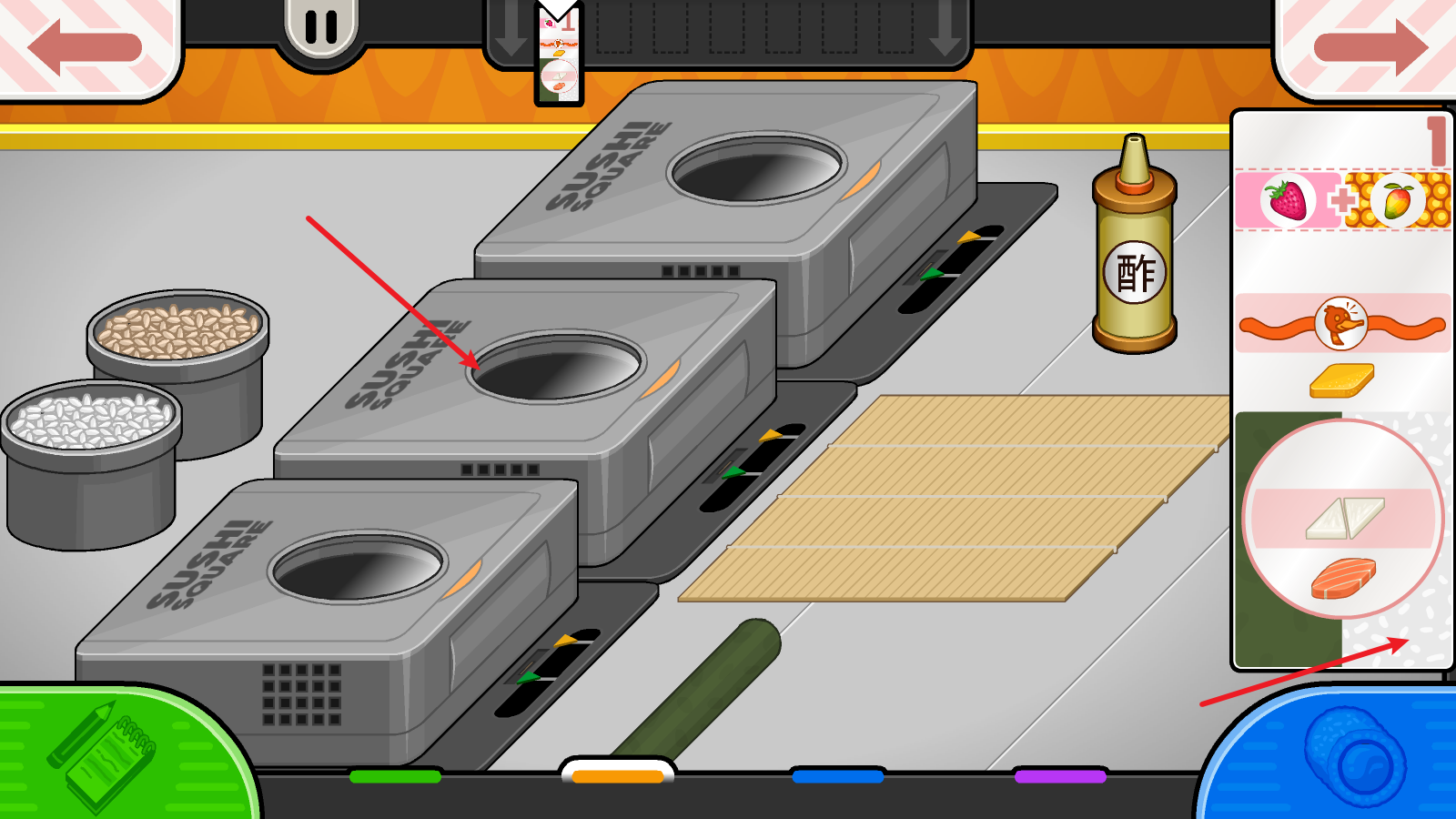 2、接下来要把握米饭成熟的时机,当进度条走到绿色箭头处时,就需要加入酢;等走到橙色箭头的位置,就得把米饭取出来了。