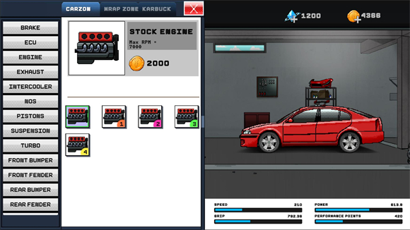 10、在主界面点击Garage,然后再点击carzon可以用金币购买各种车辆配件来进行改造。