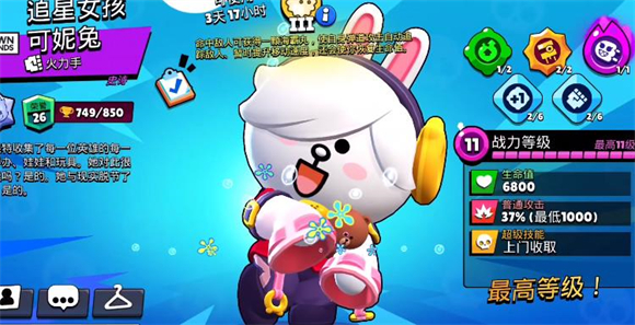 5、妮塔,妮塔的普攻丝滑且容易命中,而且极限充能后丢出的熊熊伤害很高,在掩体多草丛多的地图发挥很不错。