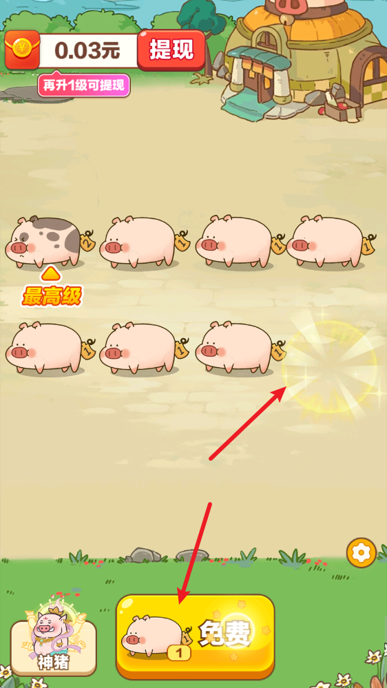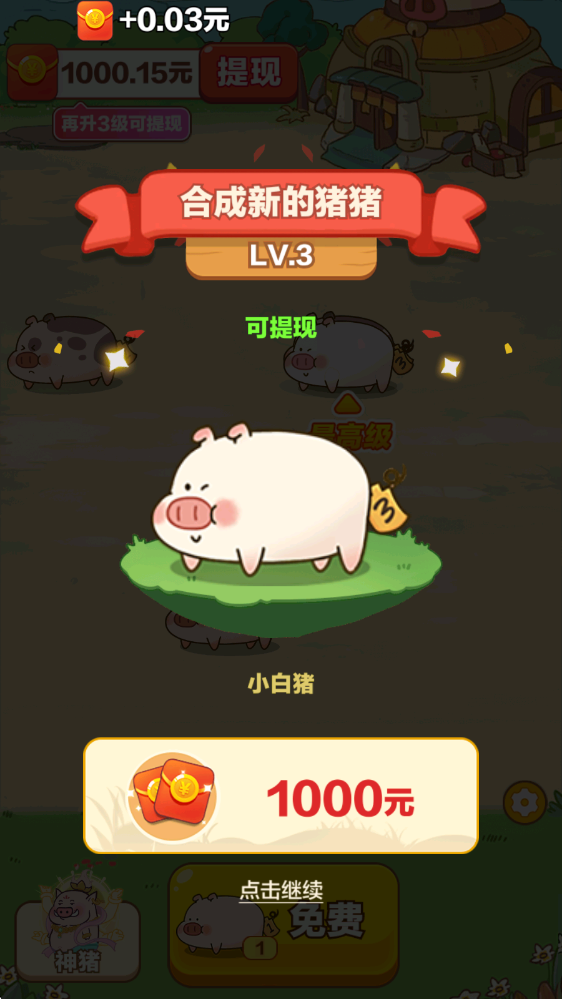 1在游戏里,只要点击底部的按钮,系统就会依据当前已达到的最高等级,随机产出一只小猪形象。