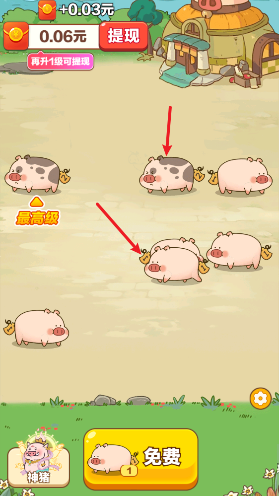 2把相同等级的小猪拖到一处,就能让它们合二为一,进而解锁更高级别的小猪。