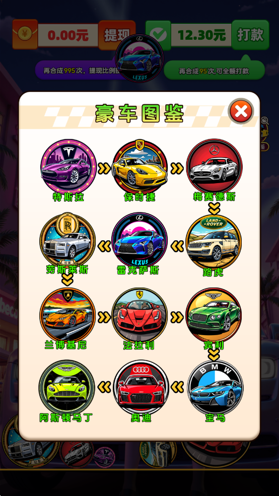 3、游戏里的最高等级为12级,对应的是超级跑车阿斯顿马丁,要是能合成出来,还能得到意想不到的惊喜奖励呢。