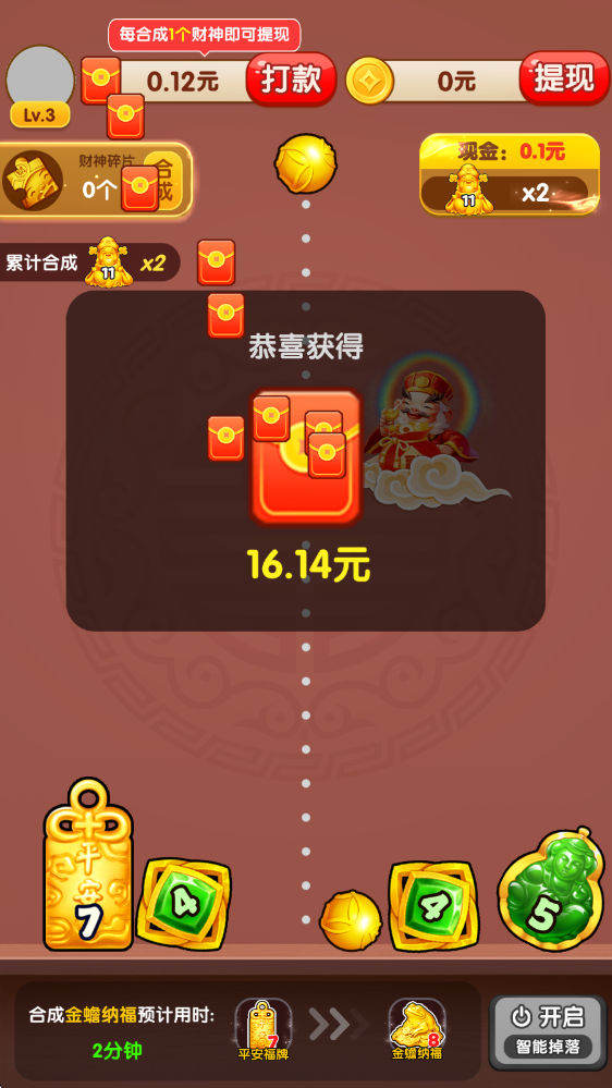 2、通过简单的合成就能够不断的去获得更高等级的物品,合成出最高级的财神还能够获得额外的奖励。