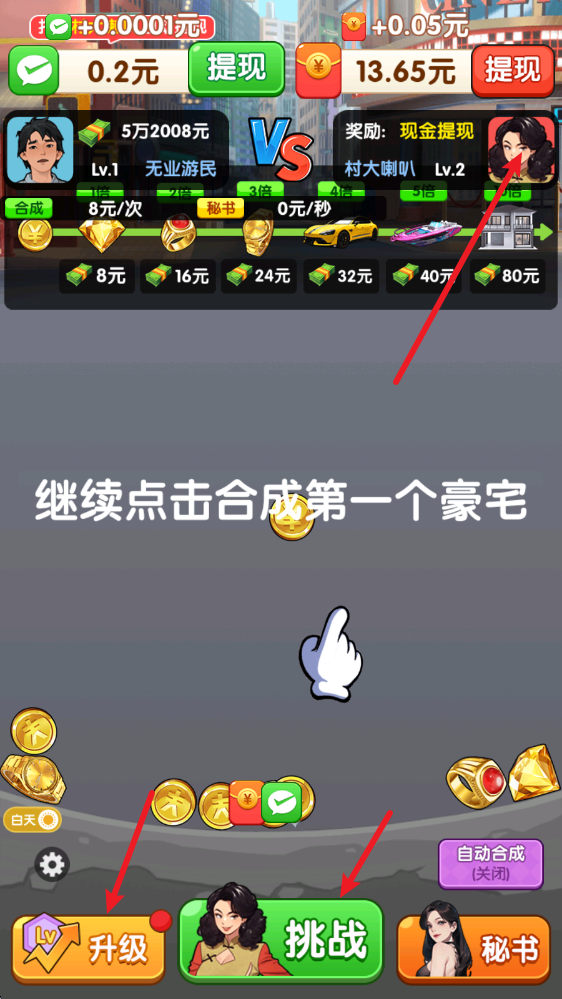 融入了丰富剧情和多样玩法一款合成小游戏,我们需要通过不断的点击来进行合成,以此来提升自己的资金实力,然后去升级自己,从一名无业游民慢慢的成长为商业巨擘!不仅如此,我们在升级的过程中还会收获到非常丰富的奖励哦!