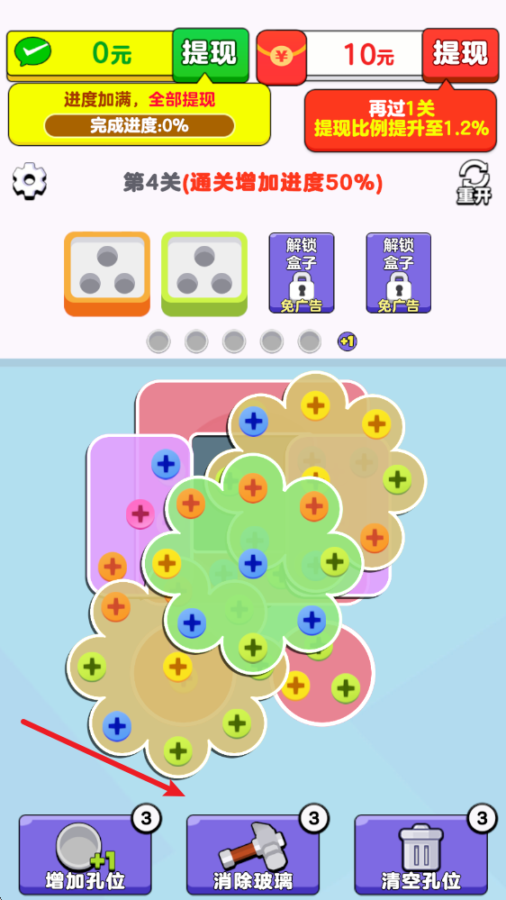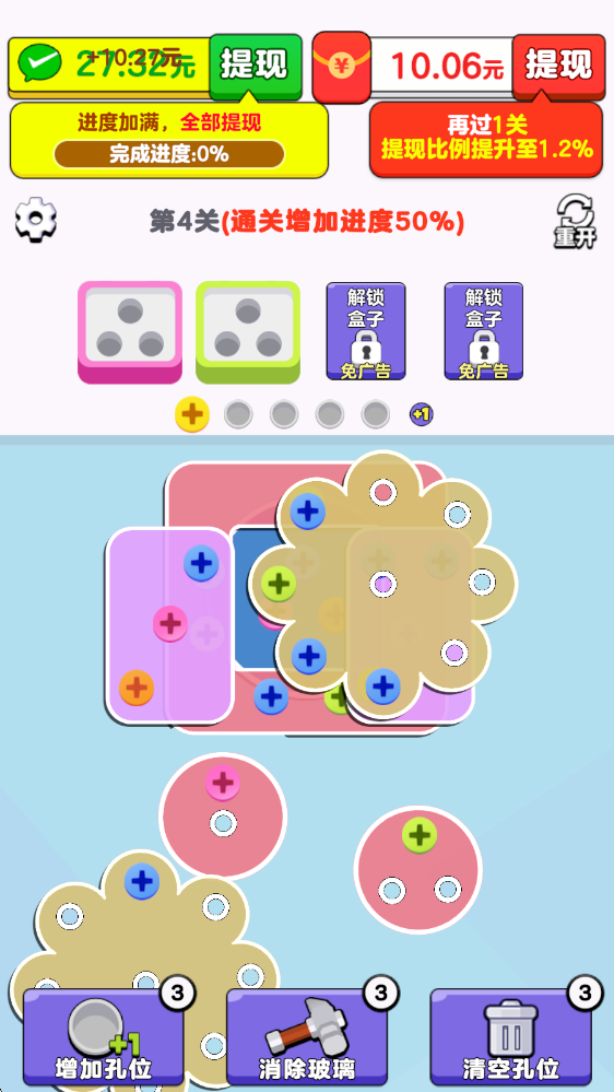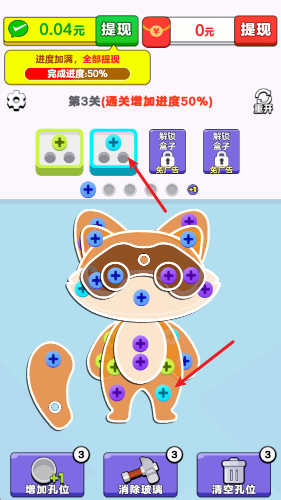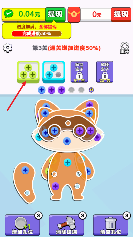 2、只要在螺丝盒里成功装满三颗螺丝,这个螺丝盒就会消除,同时会随机出现另一个螺丝盒。