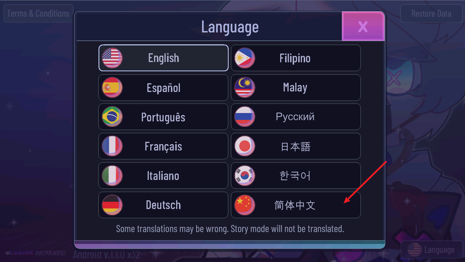 1、进入游戏前,在主界面这里我们点击右下角的language。