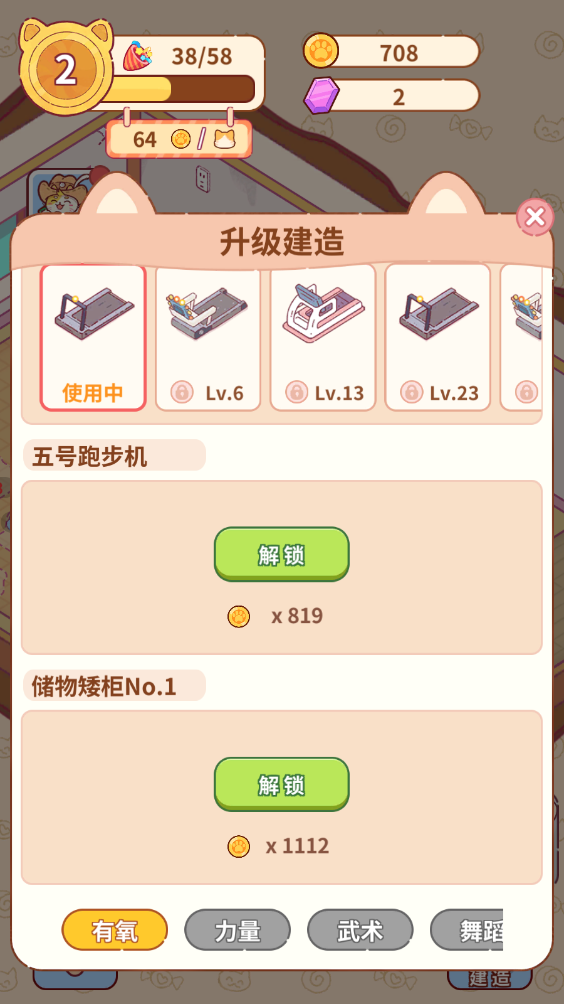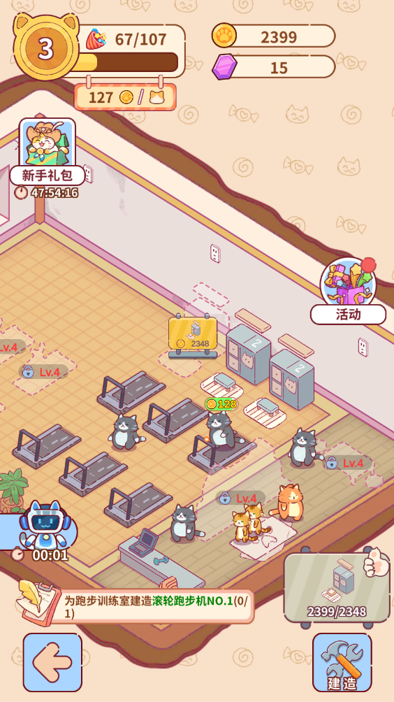1、自由的建设你的猫咪健身房,不断的去建设与升级你的健身设备,提高经营的收益,赚取更多金币。