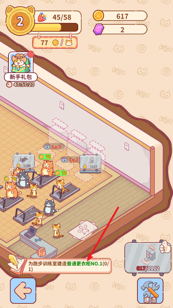 1、进入游戏后,我们首先点击右下角的建造,在这里可以去建设健身房的各种房间。