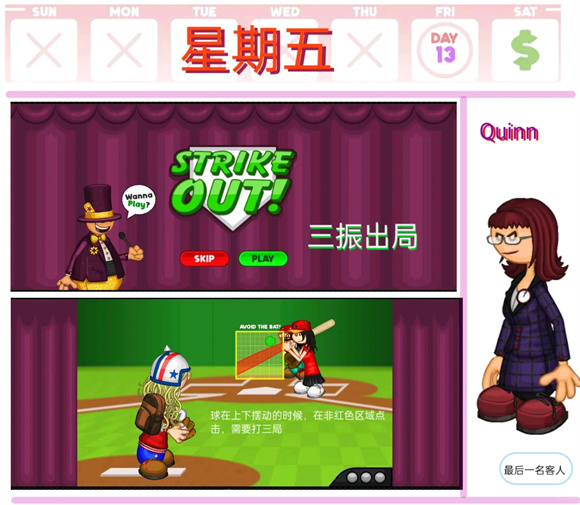 5、三振出局:当球上下摆动时,需在非红色区域点击,游戏共进行三局。