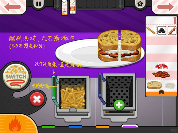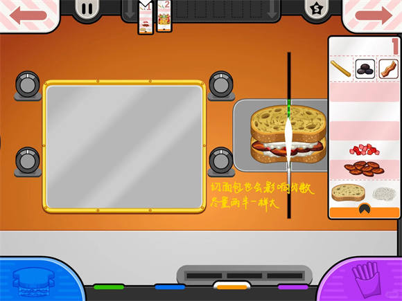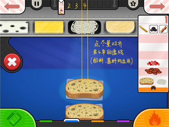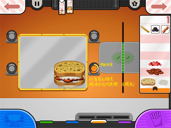 2煎制面包时,留意温度表的颜色变化,当指针刚要或刚开始转为橙色时就达到理想状态了,这个时机把握得越精准,得分就越高。
