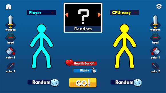 2选择对战模式后,你可以对自己的角色进行定制,包括挑选武器、装饰以及设定火柴人的颜色。等所有选项都确定好,点击GO就能开启战斗了。