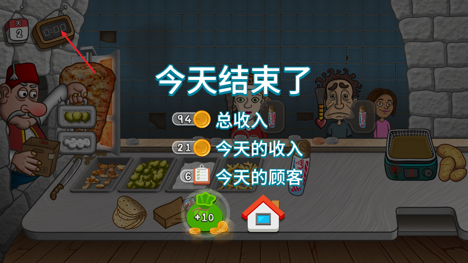 7、左上角的倒计时结束后就会结束经营,并计算一天的收入。