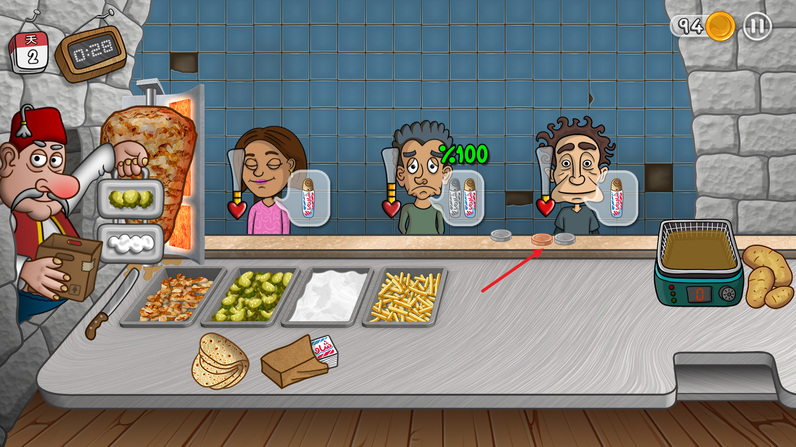 6、将制作好的沙威玛递给顾客即可,然后顾客就会在原地留下金币,点击即可收起来。