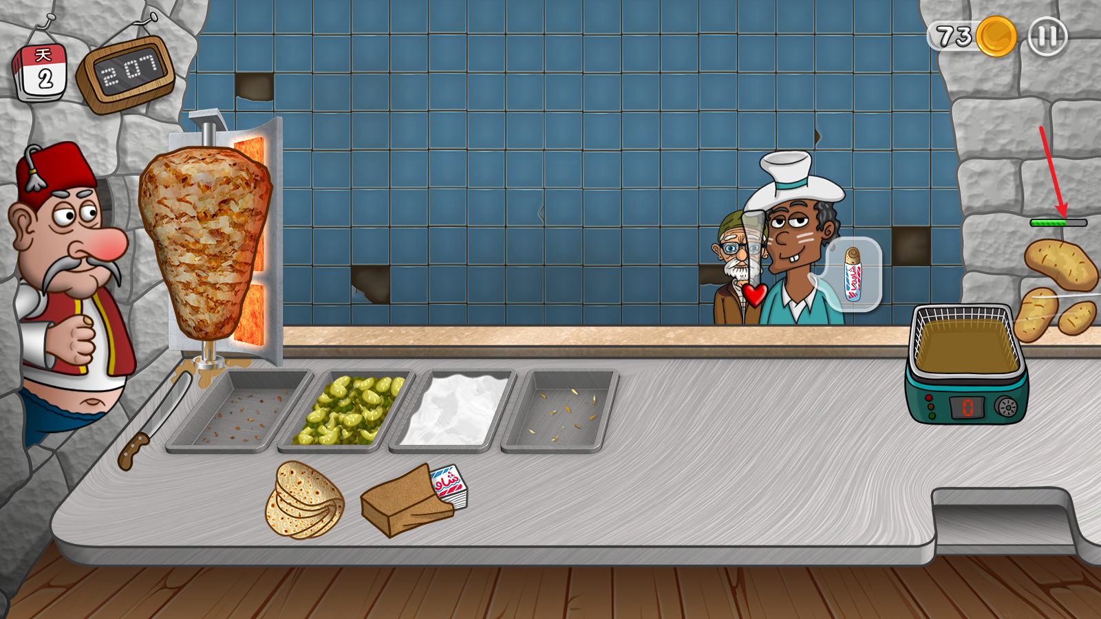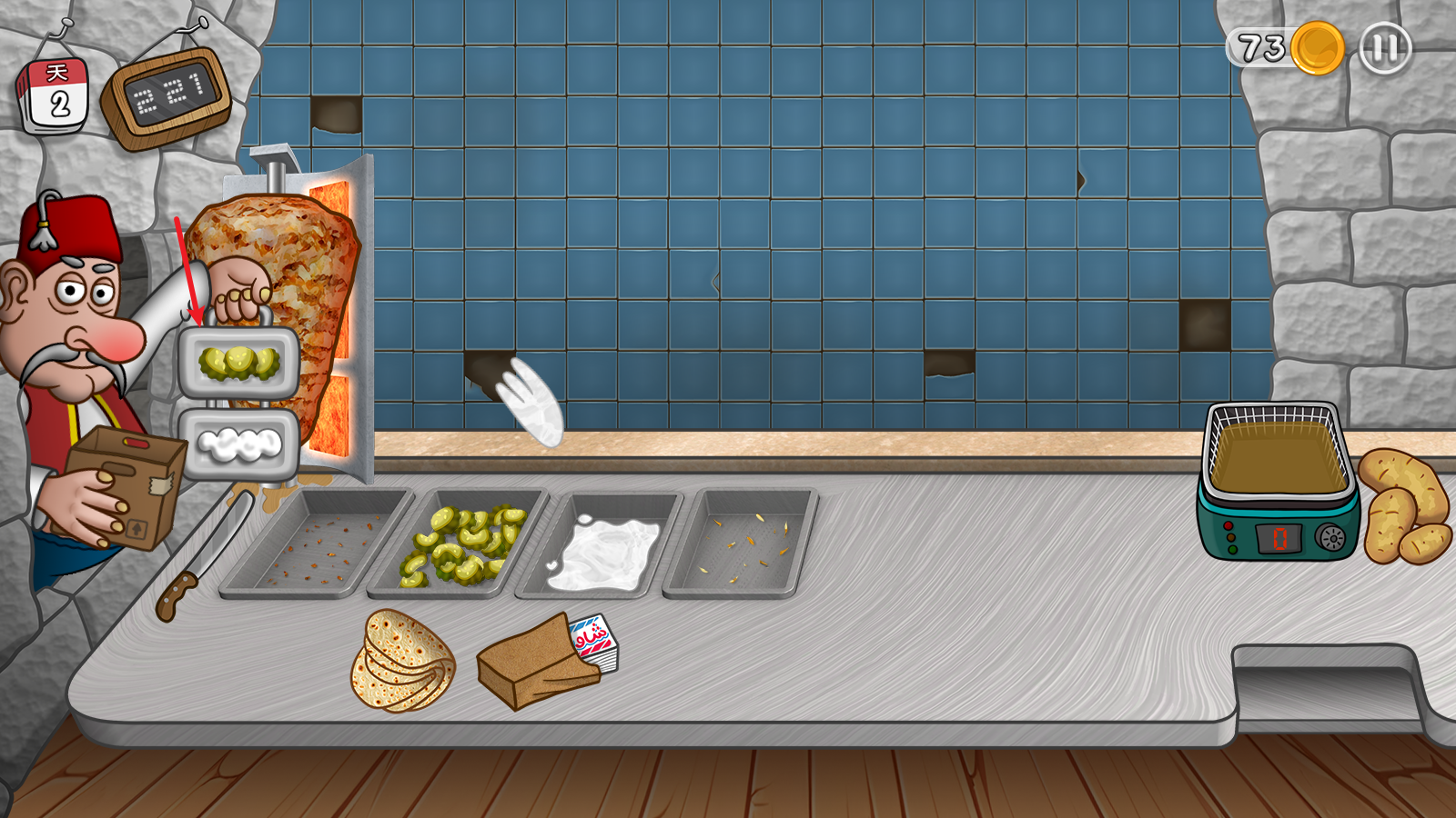 7、后期感觉很难过关时,使用乱炖大法。直接给饼皮/只给烤肉,虽然做错扣钱但顾客够多,能比平时多接待20+顾客。
