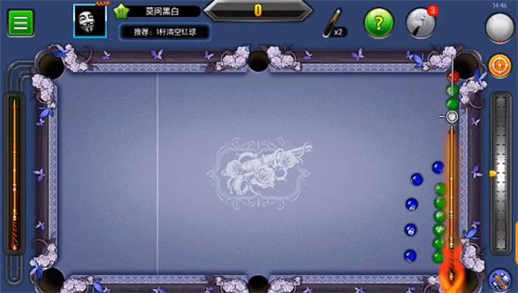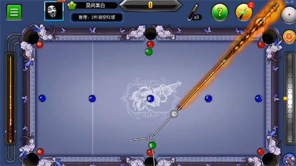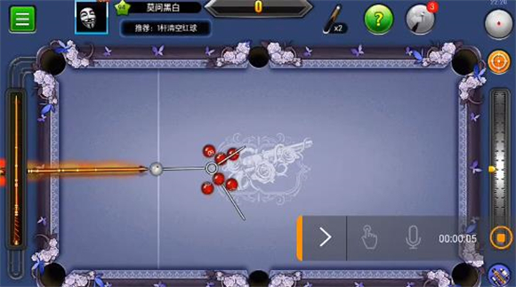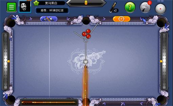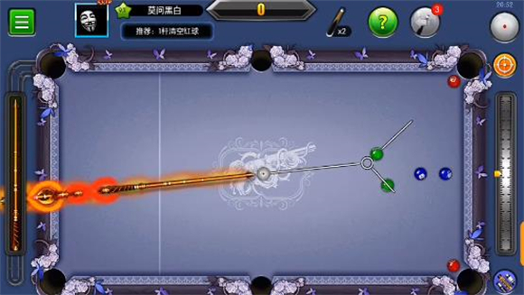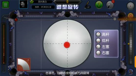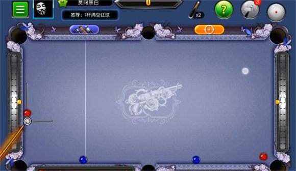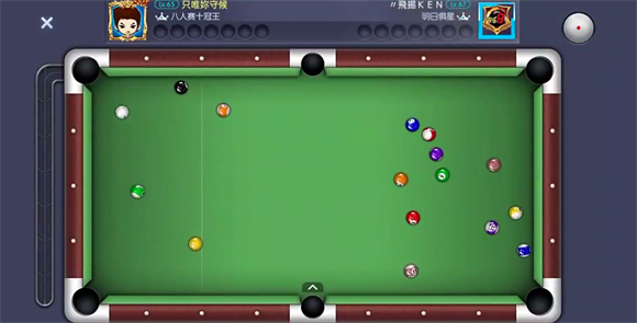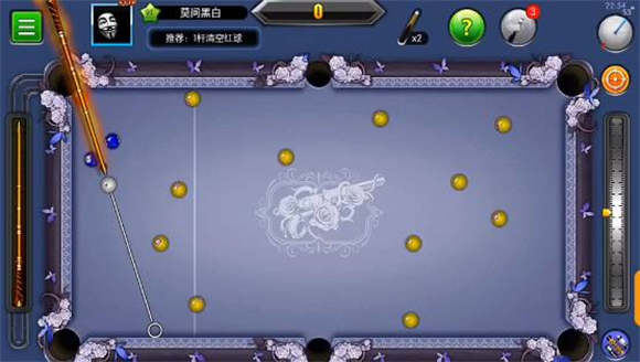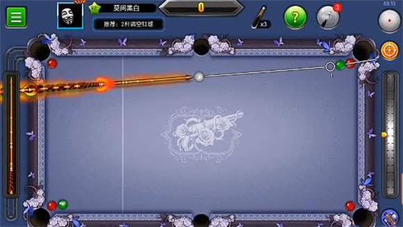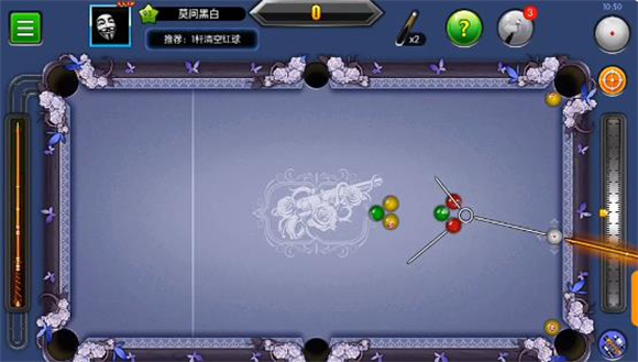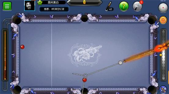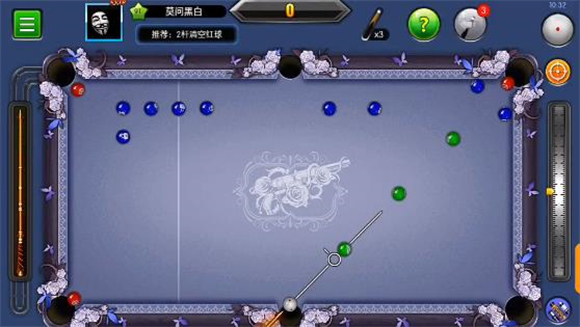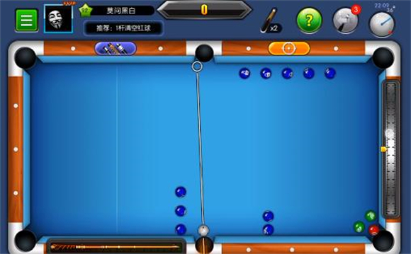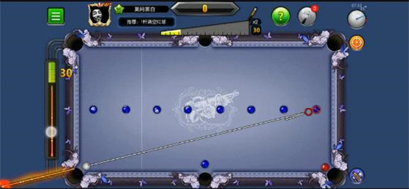 6游戏开始时,先对准最右侧的蓝色球,接着采用右侧加塞的方式,以25度的角度打出扎杆弧线球,把击球力度调到最大就行。由于球杆不同可能需要适当调整参数,这一点可以自行尝试摸索。