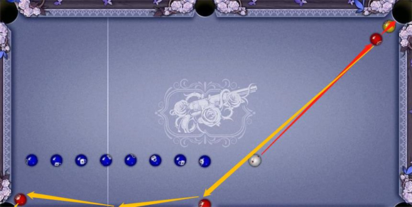 3、这一关操作起来稍显繁琐,大家可以按照图中标记的位置摆放白球,对准下方的中袋后全力出杆;接着留意第二个红球的行进路线,它需要通过四库反弹才能落入下方中袋。要是第二个红球的线路出现偏差,只需微调一下塞位,往上或往下稍微调整一点点即可。