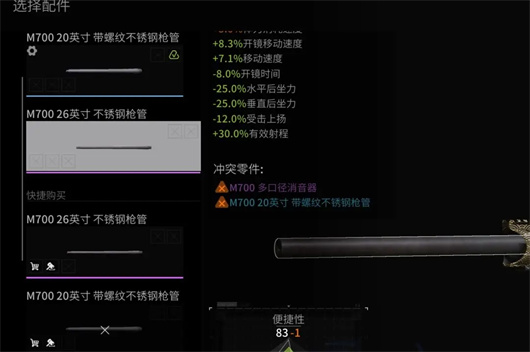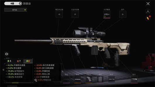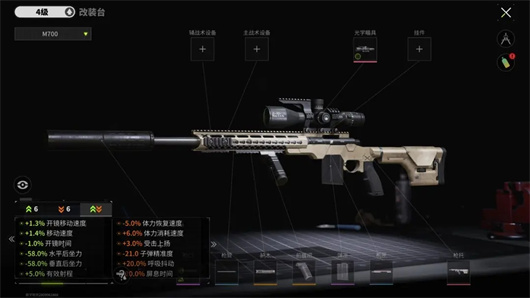 在部分开阔的地图里(像秋山这种),我们得具备狙击能力,这样能方便进行中远距离的对枪战斗。搭配配件时,要重点关注开镜移动速度、有效射程以及隐蔽性。拿改装选择丰富的M700来说,我们可以选用能实现超远距离开镜狙击的紫色枪管,虽然这个枪管没办法安装消音器,但能提升30点有效射程,具体可参考下图。