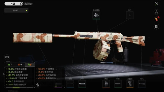 在部分室内对抗或抢点推进的排位对局里,近距离贴脸的战术思路相当常见,核心武器多为冲锋枪与霰弹枪。既然主打近战,不妨牺牲部分精准度与瞄准相关的属性,侧重提升移速和耐力表现。拿SG-12这款霰弹枪来说,它的配件组合能带来可观的体力回复加成与移动速度增益,机动性堪称一流,近距离压制力也十分出色,具体的属性面板与配件搭配可参考下图展示。