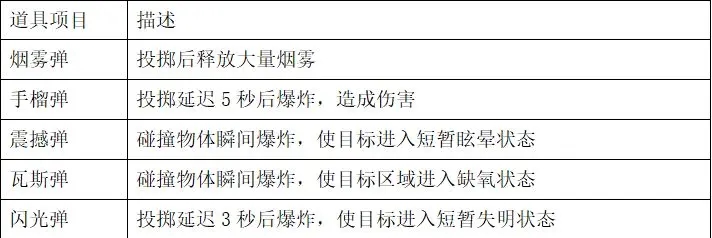 游戏里虽然能直接买道具,但新手玩家可能会觉得成本太高。其实更划算的方式是在地图里的投掷物箱子里捡,或者从敌人那里缴获。特别推荐紫色的震撼弹,它能让敌人短时间失去行动能力,不管是主动进攻还是紧急撤退都很实用。其他类型的投掷道具,大家可以根据自己的偏好,参考下面的表格来搭配使用。