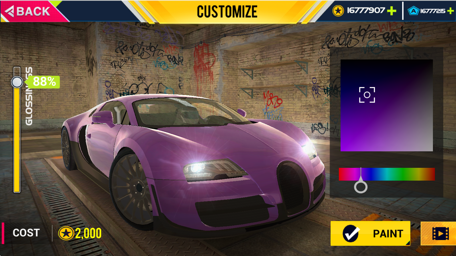 2、你可以自由定制自己的爱车,对汽车进行全方位改装,无论是车身喷漆、轮毂颜色,还是车窗、LED灯,每一处细节都能按照你的喜好来定制。