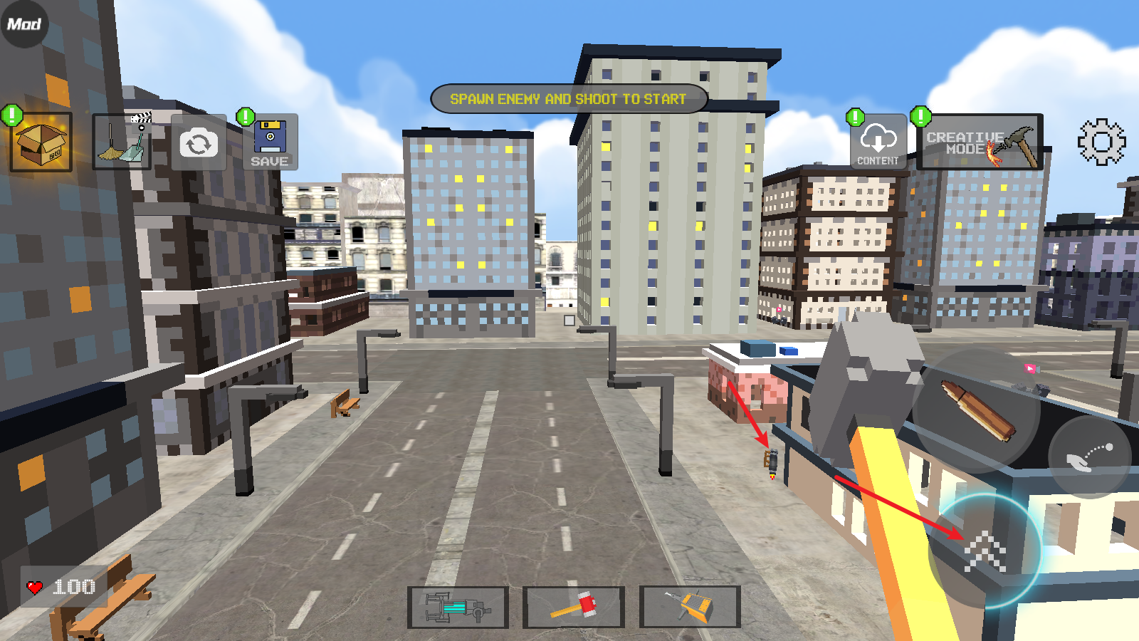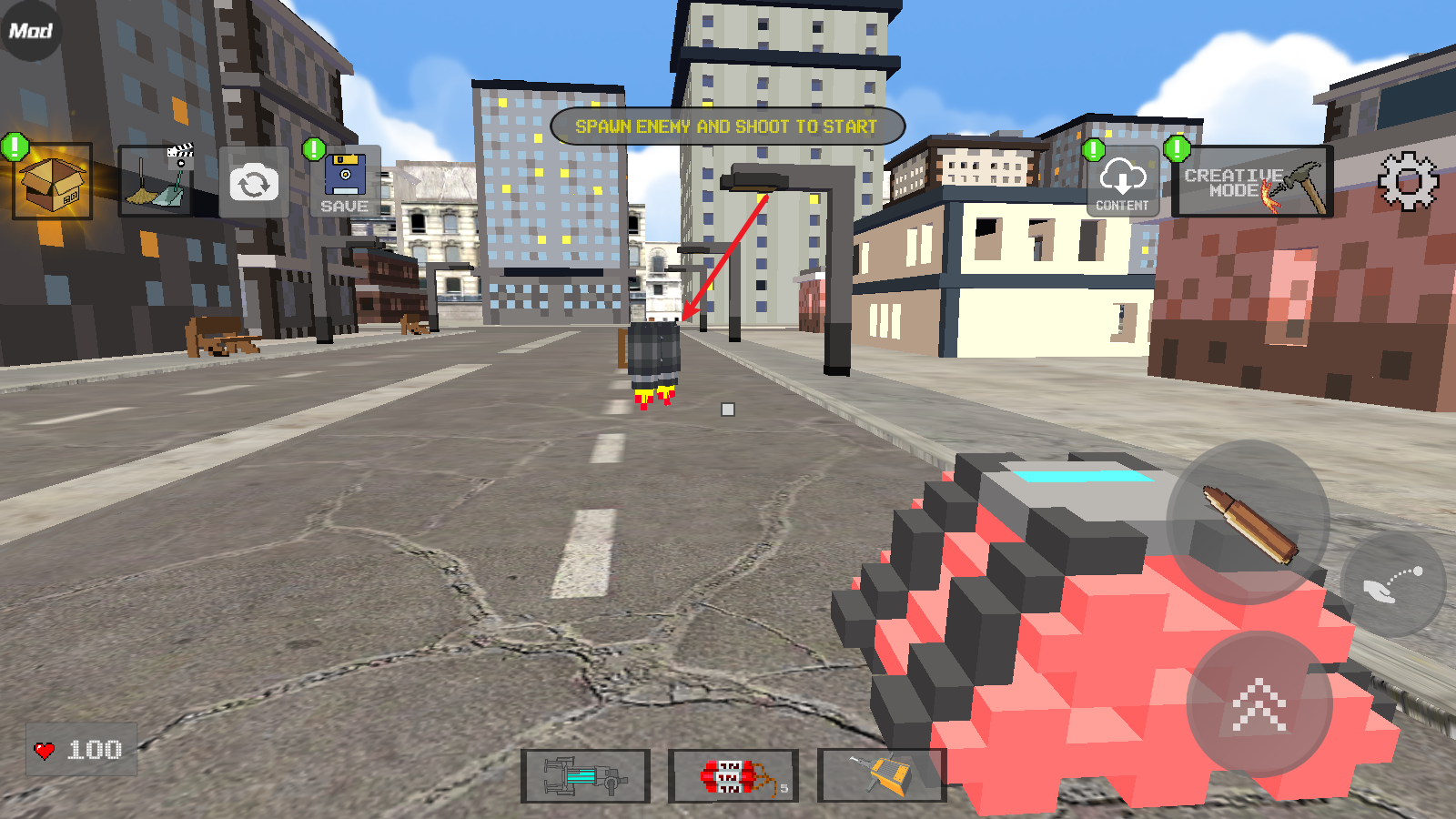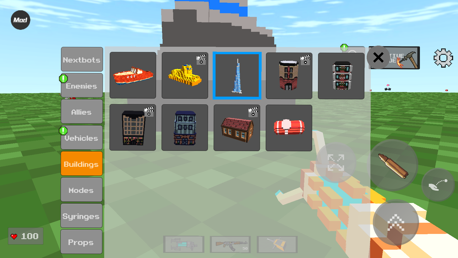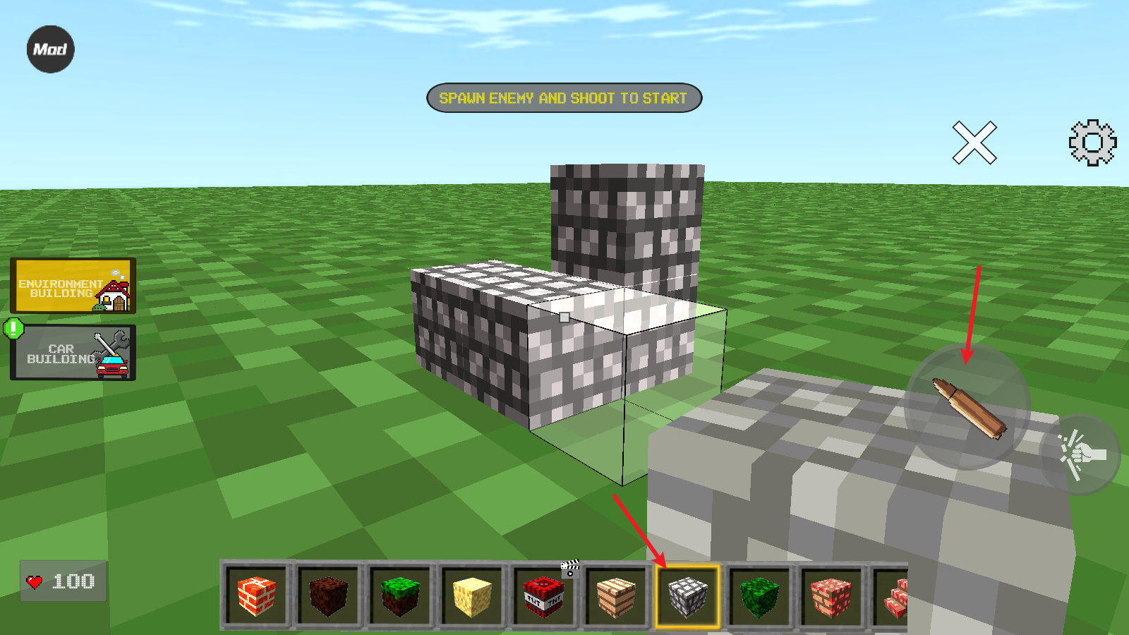 3、接下来我们就可以选择不同的方块来建造了,点击子弹图标是放置操作,点击拳头图标则是撤销操作。