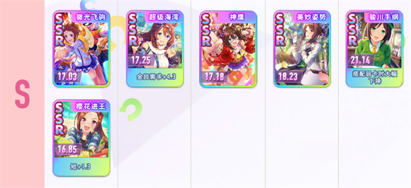 1、最高级别的支援卡包含以下这些:能带来微弱光芒的飞马、象征樱花盛开的王者之马、拥有超凡能力的海湾相关角色、翱翔天际的神鹰、姿态优美动人的角色,以及名为骏川手纲的角色。