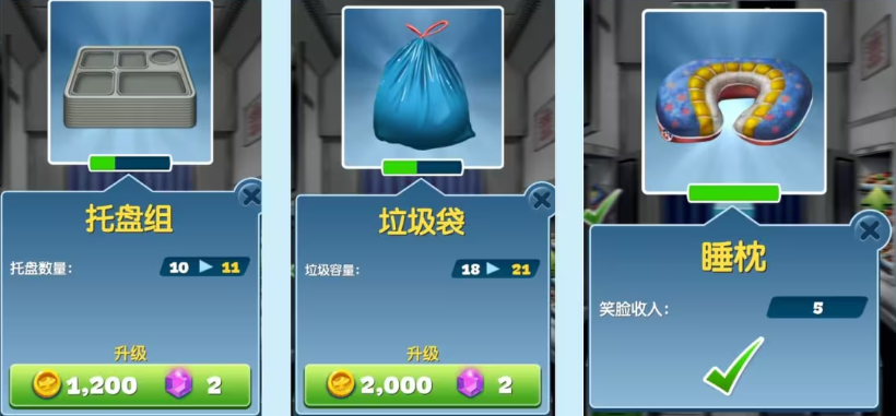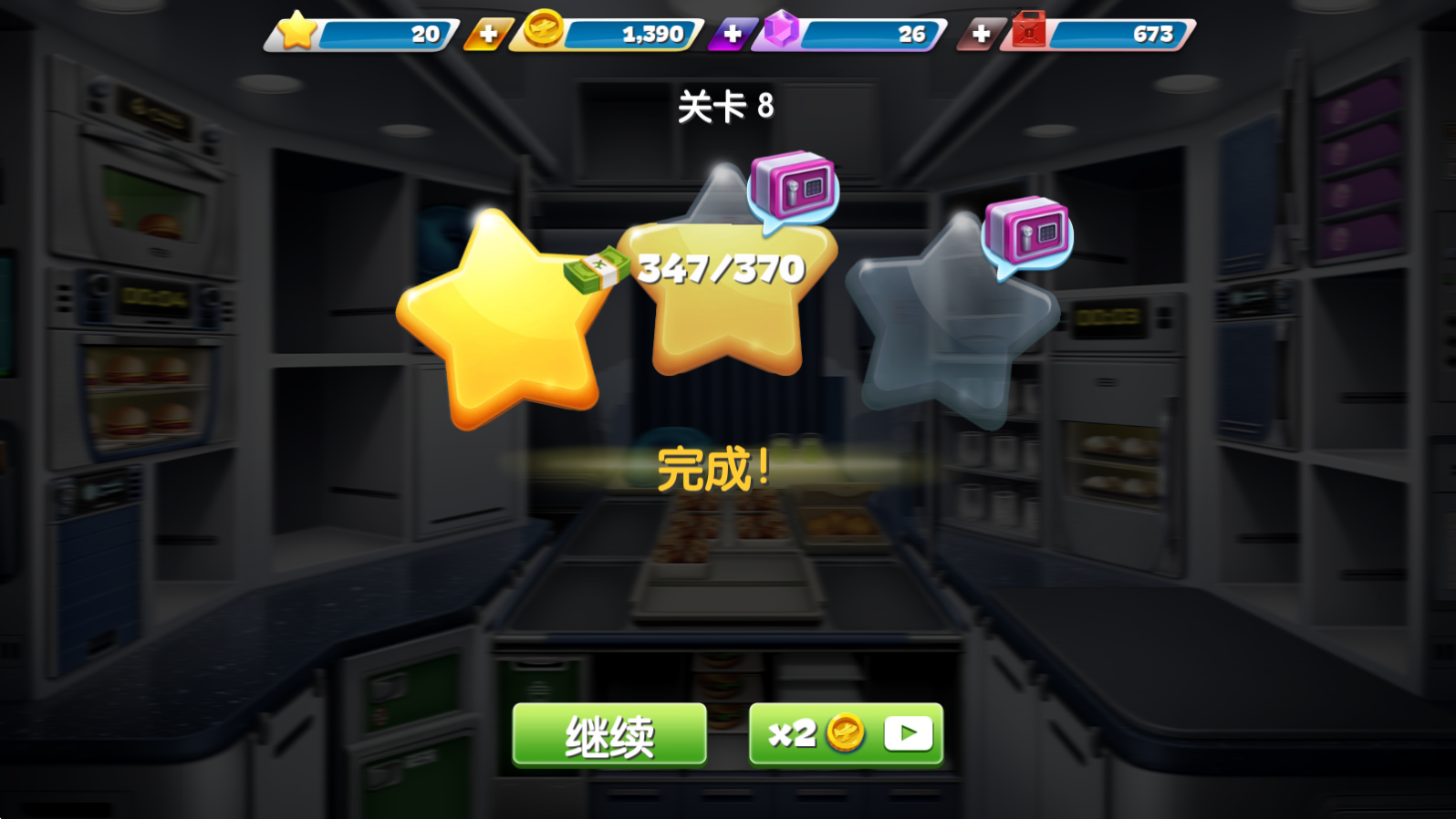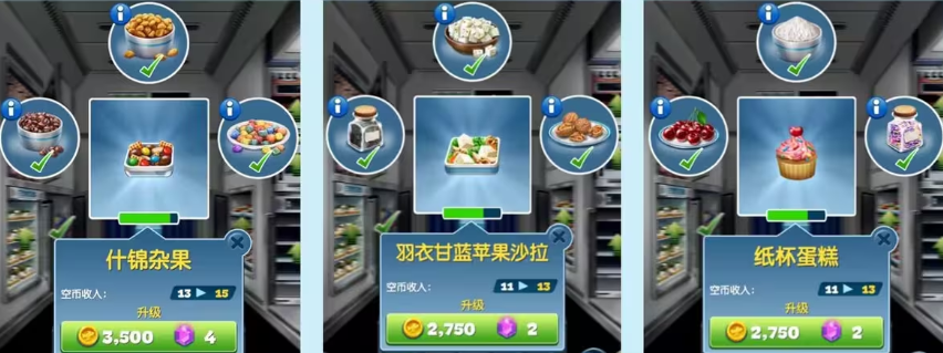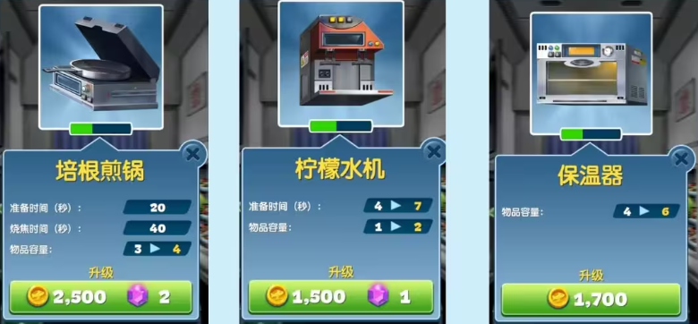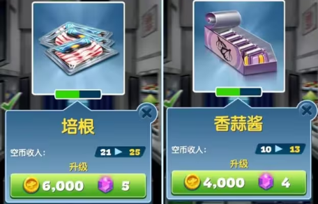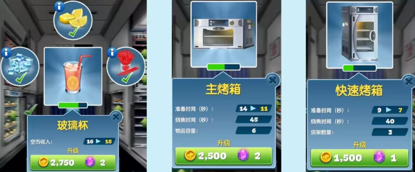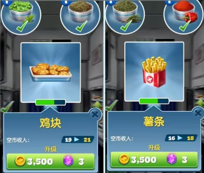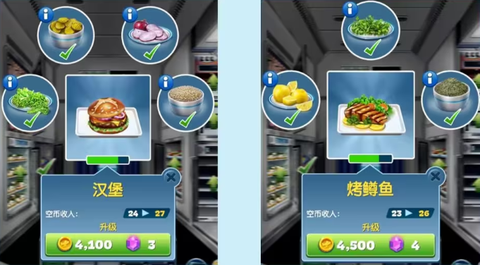 4、菜品与餐具的升级策略:食材升级应优先于金币升级;菜品重要性排序为:汉堡、烤鳟鱼>纸杯蛋糕、什锦杂果、羽衣甘蓝>鸡块、薯条>柠檬水(杯子)、培根、香蒜酱。