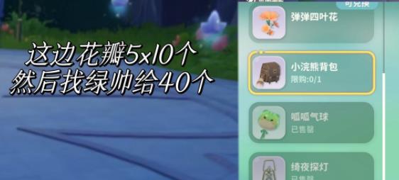 5、小浣熊背包:每日7点可以去看烟花,然后到地图这边有金发美女这里拿10次花瓣一共50个,然后玩找绿帅小游戏给40花瓣,按照去活动页面就可以兑换了。