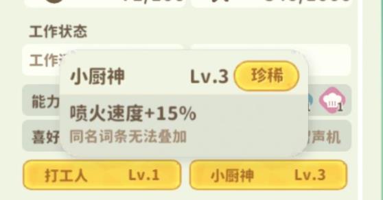 3、工作等级能够大幅度影响工作效率,所以能高就高,优先烹饪,手工,浇水。工作等级可以通过完成对应工作来提升,除此之外还可以通过闪闪词条来提升等级。