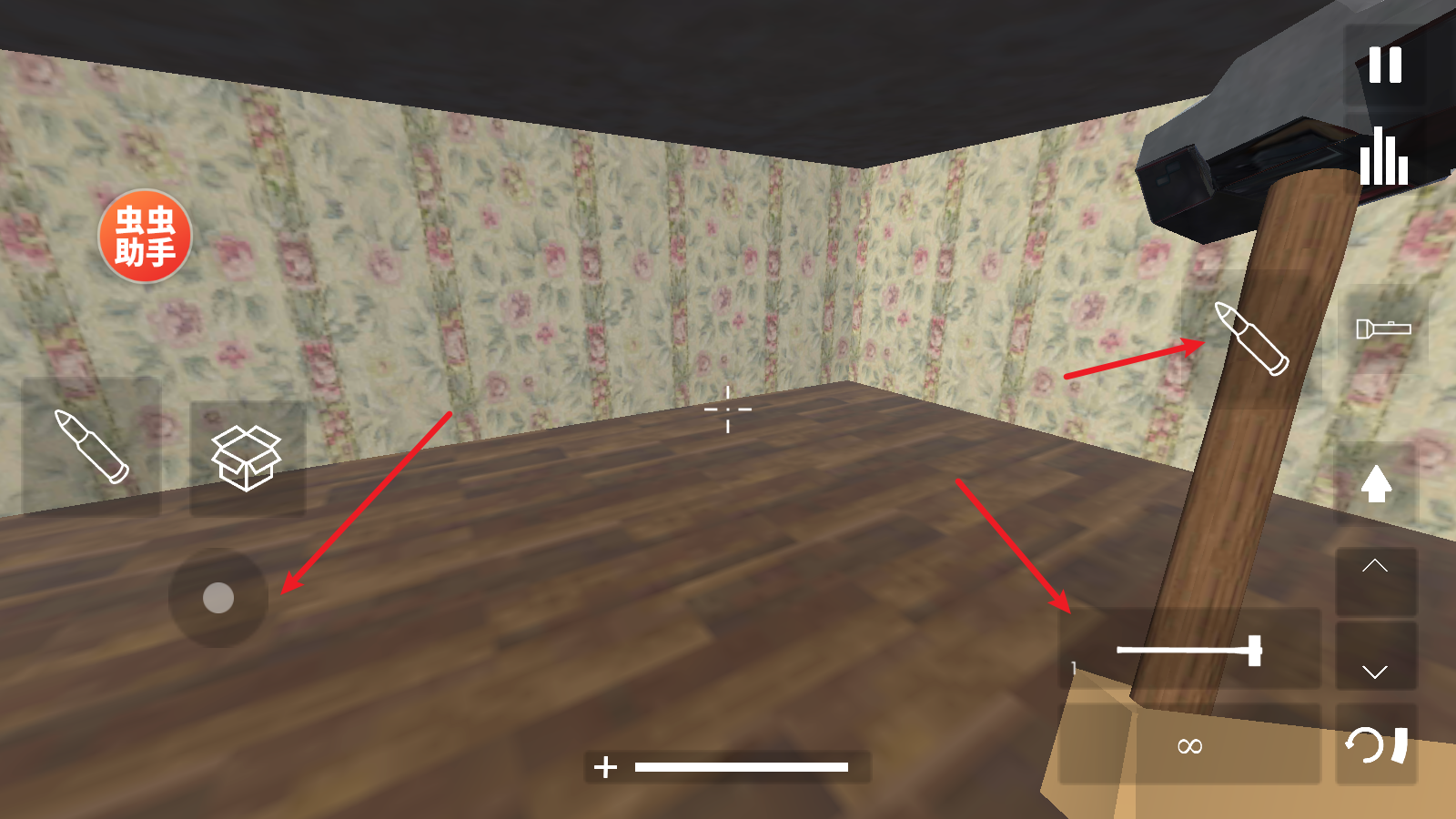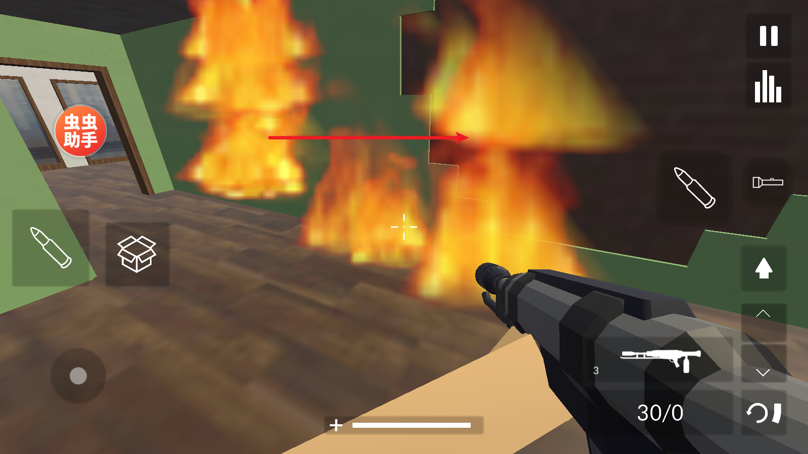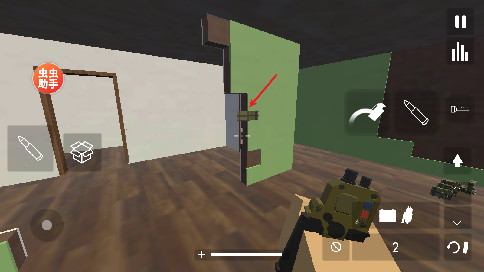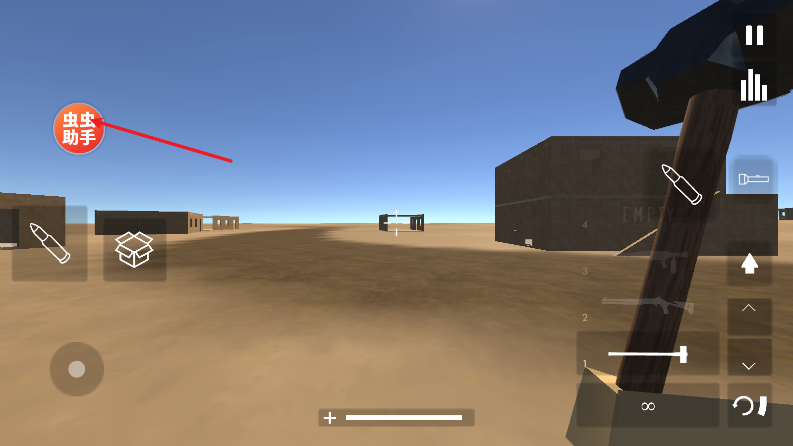 3、进入后,通过左侧的摇杆控制移动,右侧的武器点击即可切换,上方的子弹则是攻击。